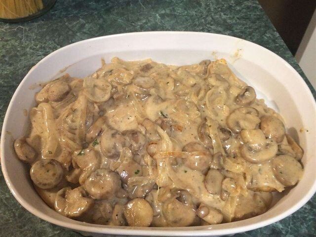 Куриные грудки обжариваются в сливочном масле, затем запекаются с грибами, луком и белым вином. Завершающим штрихом является изысканный слой расплавленного сыра Грюйер сверху. Если вы любите богатую французскую кухню, то этот рецепт вам понравится. Подавайте горячим с рисом. ¼ стакана цельнозерновой муки ½ чайной ложки соли ¼ чайной ложки перца 1 чайная ложка рубленой свежей петрушки ½ чайной ложки сушеного укропа ¼ стакана сливочного масла, разделить 4 половинки куриных грудок без костей и кожи ¼ кг свежих грибов 1 луковица, нарезанная кольцами ½ стакана белого вина 250 гр сыра Грюйер, измельченного.