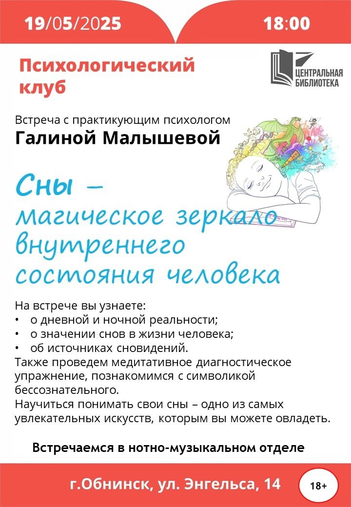 👥19 мая в 18:00 в Центральной библиотеке в Обнинске состотся встреча психологического клуба.