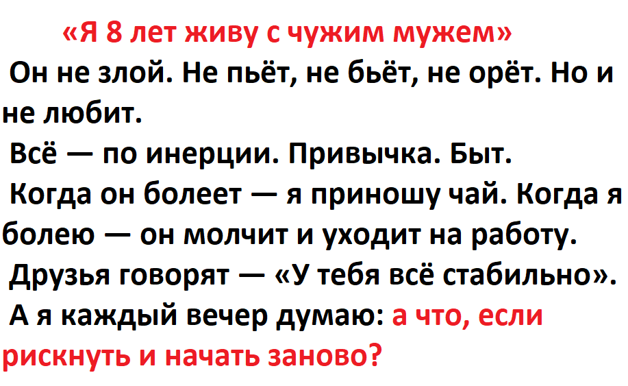 И да, бывает и грустно, и смешно, но уж точно — не скучно. Когда он сказал: «Я тебя больше не люблю», я спросила только одно: