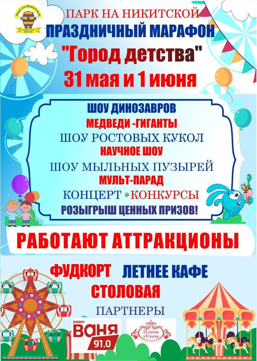 ПРАЗДНИЧНЫЙ МАРАФОН🎉 Парк на Никитской приглашает вас на праздник День защиты детей!🥰 Устройте вашим деткам незабываемый праздничный день🌈 🎭 Шоу ростовых кукол 🫧 Шоу мыльных пузырей 🎤 Концертная программа 🎈 Конкурсы и ценные призы 🎠 Аттракционы 🍦 Фуд-корт с вкусняшками Встретим лето и проведем праздник весело и ярко!☀️ 🗓️ 31 мая и 1 июня в Парке на Никитской 📍Мы находимся по адресу: ДРЦ "В гостях у Сказки" в Парке на Никитской, г. Кострома, ул.Никитская, 96Б. 🕙Режим работы: С 10:00 до 21:00 без выходных 📞Информация: 8(4942)42-20-27