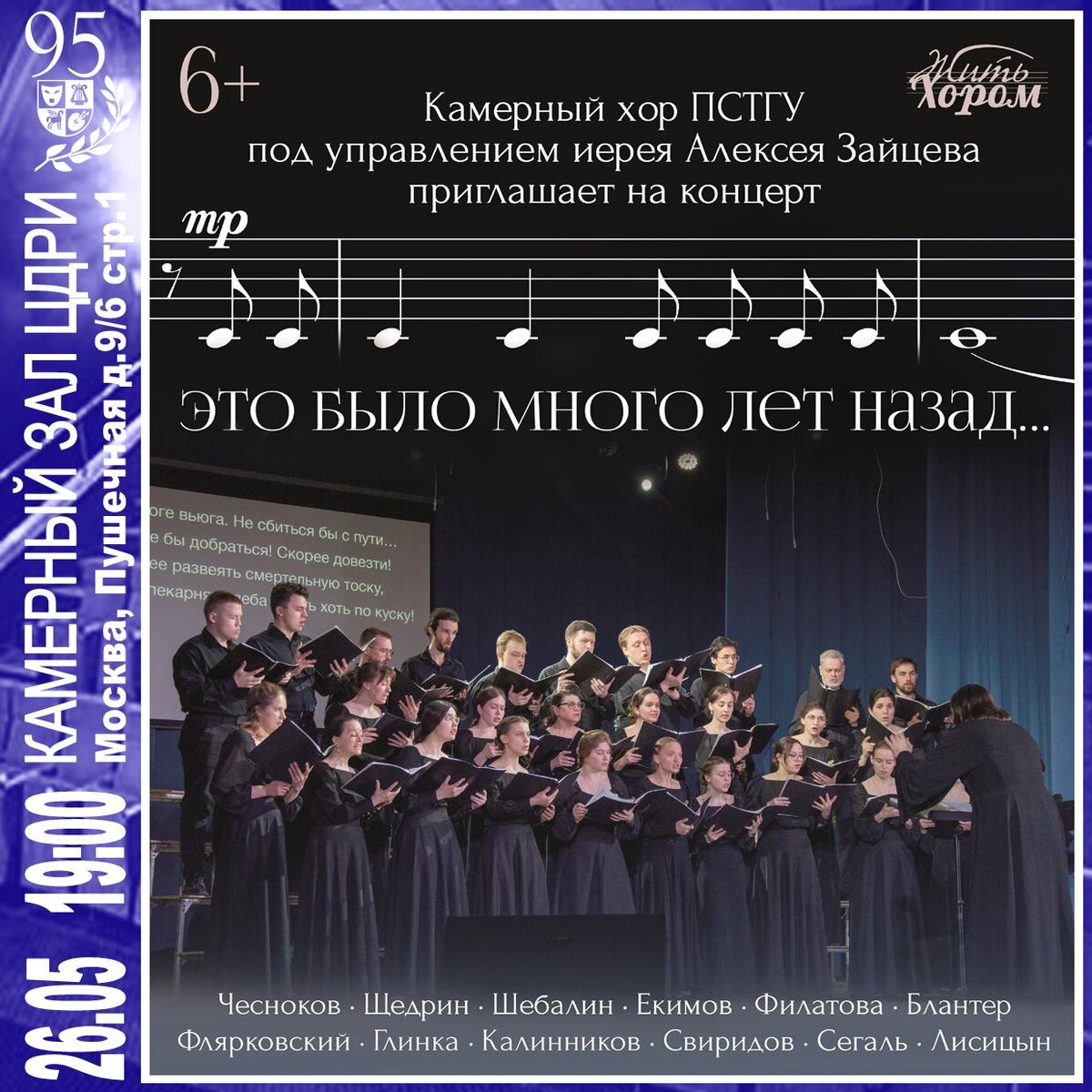 Камерный хор ПСТГУ — «Это было много лет назад…» Камерный хор ПСТГУ под управлением иерея Алексея Зайцева представляет новую концертную программу на сцене Центрального Дома работников искусств! Концерт с названием «Это было много лет назад…» — это музыка, которая становится проводником в историю нашей страны и обращает внимание на самые главные темы человеческой жизни. Хоровая классика здесь органично переплетается с произведениями современников. П. Чесноков, Р. Щедрин, В. Шебалин, С. Екимов, Н. Филатова, М. Блантер, А. Флярковский, М. Глинка, В. Калинников, Г. Свиридов, С. Сегаль, Прот. М. Лисицын Особое внимание в программе уделено произведениям о Великой Отечественной войне. Впервые в исполнении хора прозвучит весь цикл Александра Флярковского «Ленинградская тетрадь». Билеты на сайте: https://choirpstgu.timepad.ru/event/3354732 ЦДРИ: г. Москва, ул. Пушечная 9/6 стр.1