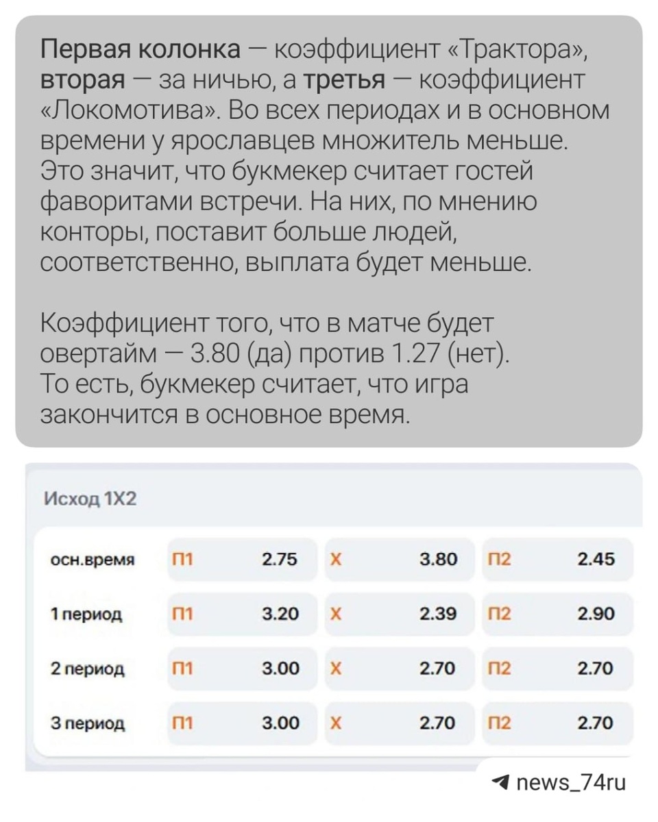 Самые крупные букмекеры России определили фаворитом «Локомотив» и понизили коэффициенты команды Ну ничего, ничего... Ещё посмотрим. Сегодня третья игра финальной серии «Трактора» против «Локомотива», она пройдет в Челябинске. Обычно это считается благоприятными условиями для принимающей команды, но букмекеры сделали коэффициент «Локомотива» на победу в матче ниже, чем у «Трактора». Челябинец Даниил Белов (имя изменено) много лет профессионально занимается ставками. Он рассказал @74.ru, что фаворита выбирает сам букмекер, исходя из собственных представлений о командах. 🔚 Букмекер видит, на какую команду уже сейчас ставят больше — это влияет на коэффициент. Плюс специалисты учитывают состояние команд — какие игроки, сколько у них очков, у какой из команд было больше побед. В том числе, в прошлых сериях. Отсюда и получаются цифры множителей для ставок на каждую из команд. Меньший коэффициент на фаворитов дают, потому что большинство людей ставит на тех, кто, вероятно, победит. И бук