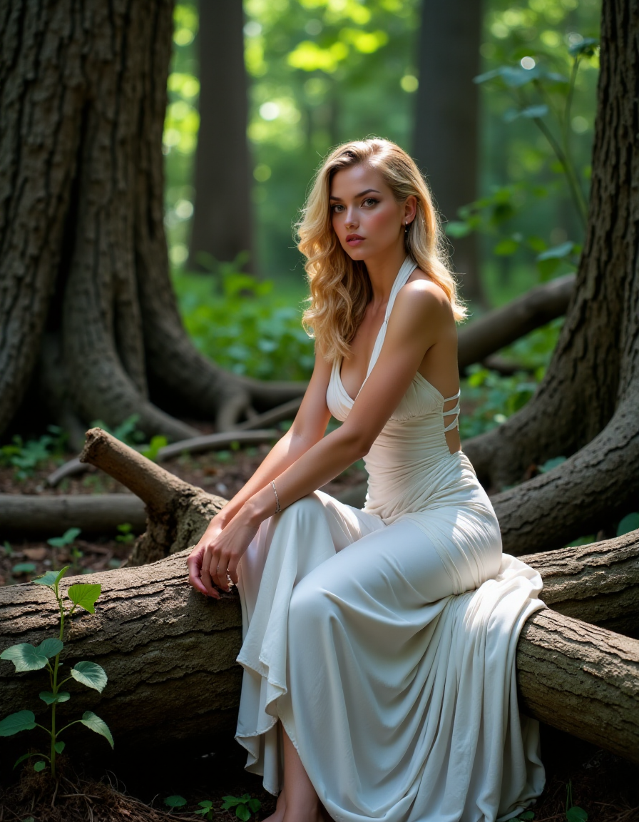 Давненько я тут ничего не писал, но видно теперь придется делать это чаще из-за новой политики Дзена (он не платит теперь денег за просмотры роликов, об этом я еще отдельно выскажусь). Ну и раз я сейчас в плотную занимаюсь генерациями в нейросети, то и писать статьи буду больше на эту тему. Сегодня хочу поделиться несколькими промтами и иллюстрациями к ним. Так что если вы любите генерировать, то можете пользоваться этими промтами, мне не жалко) Данная подборка вся сгенерирована на Flux. И первым покажу подборку с красавицами в лесу: Промт тут вот такой: woman sitting on a tree trunk in a forest. She is wearing a white, flowing gown with a halter neckline and a low back. The gown is draped over her body, accentuating her curves. She has blonde hair styled in loose waves and is looking off to the side with a serious expression on her face. The background is filled with tall trees and greenery, creating a peaceful and serene atmosphere. The lighting is soft and natural, highlighting the