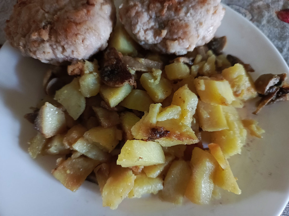 Чистим картошку и разрезаем ее на полоски или кубики. Кладем в кастрюлю с водой и ставим на огонь. Доводим до кипения и вынимаем картофель. Варить не надо. Тем временем режем кубиками шампиньоны и репчатый лук. Солим, перчим. К грибам и луку добавляем картофель, а также любимые специи и соль. Все обжариваем.