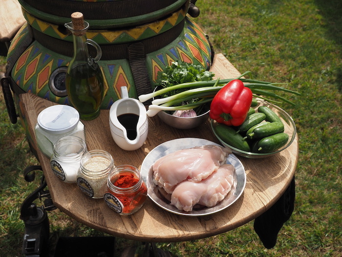 На 6 порций Сладкий перец трех цветов очистить и нарезать соломкой. Огурцы нарезать соломкой толщиной 0,5 см. Куриное филе зачистить от пленки, нарезать поперек толщиной 0,5 см. Куриная грудка маринуется в специях, растительном масле, крахмале, выдавленном на чесночнице чесноке, паприке около пяти минут. Сковороду раскалить, налить растительное масло, выложить замаринованное куриное филе. Жарить до золотистого цвета, постоянно помешивая. Добавить овощи, соевый соус, нарезанную кинзу, зеленый лук к куриному филе. Все быстро перемешать и готовить одну минуту, выложить на подготовленное блюдо. Посыпать кунжутом и украсить листиком базилика. Приятного аппетита! С Вами был Хаким Ганиев и мой друг – ЭкоТандыр! Официальный канал производства ЭкоТандыров. г.Уфа Официальный сайт Подобрать тандыр