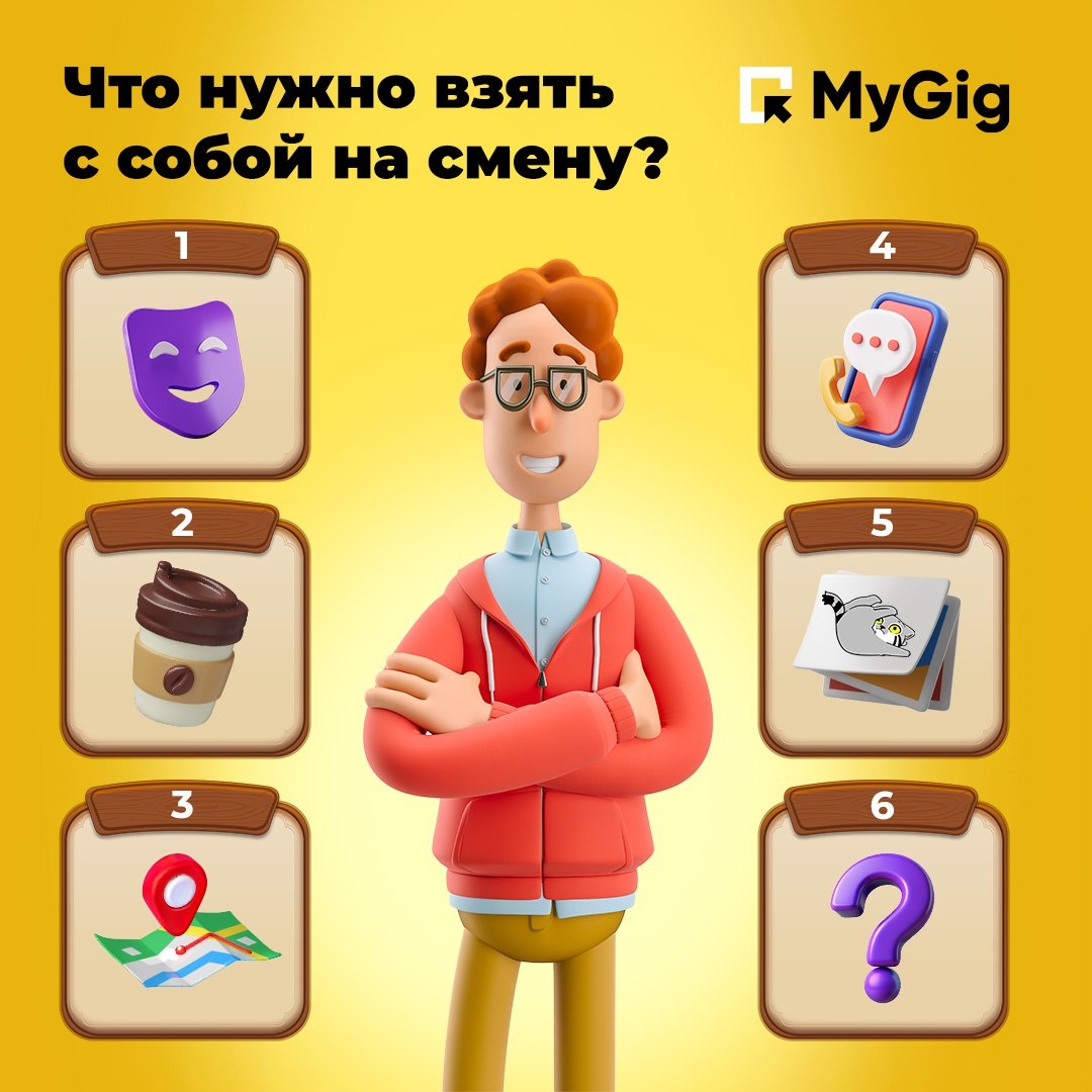 🕹 Что если бы мы могли прокачать себя на смене через MyGig словно персонаж из любимой компьютерной игры?! Пофантазировали для вас на эту тему. Смотрите на картинку и читайте описание инвентаря Гены при подработке ниже: 1️⃣ Лицо-маска «Я в ресурсе». Даже если вы мысленно ещё в кровати, а тело уже на подработке — натягиваем улыбку и получаем +5 к харизме 2️⃣ Дополнительный запас бодрости.+5 к выносливости обеспечит кофе или шоколадка, а лучше всё сразу — кто знает, что вас сегодня ожидает! 3️⃣ Карманный план побега. Мысленно проложенная карта местности «Как сбежать на обед или кофе-брейк с минимальными потерями!» — +10 к ловкости 4️⃣ Мини-набор супергероя MyGig. Плащ необязателен, но настроение «я справлюсь» — необходимо! В крайнем случае, можно использовать зелье призыва любимого координатора для снятия паралича или устранения возможных трудностей на смене 😅 5️⃣ Тайная заначка настроения. +15 к силе даст фото любимого котика, мем от MyGig в закладках или напоминание, что скоро в