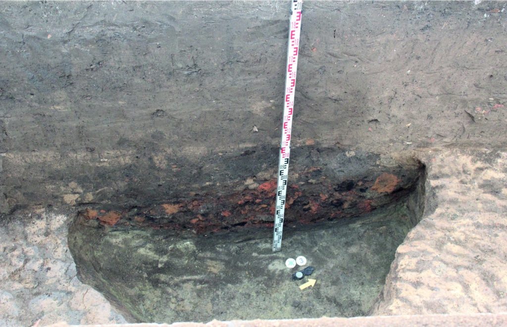 К счастью для археологов, в одном из отрезков рва в его засыпи было обнаружено большое количество обломков камня и кирпича. Многие из них с останками известкового раствора. Это позволяет ученым предполагать, что за рвом строилась стена из камня и кирпича. К сожалению, исследователи не могут определить, насколько высокой была эта стена.
