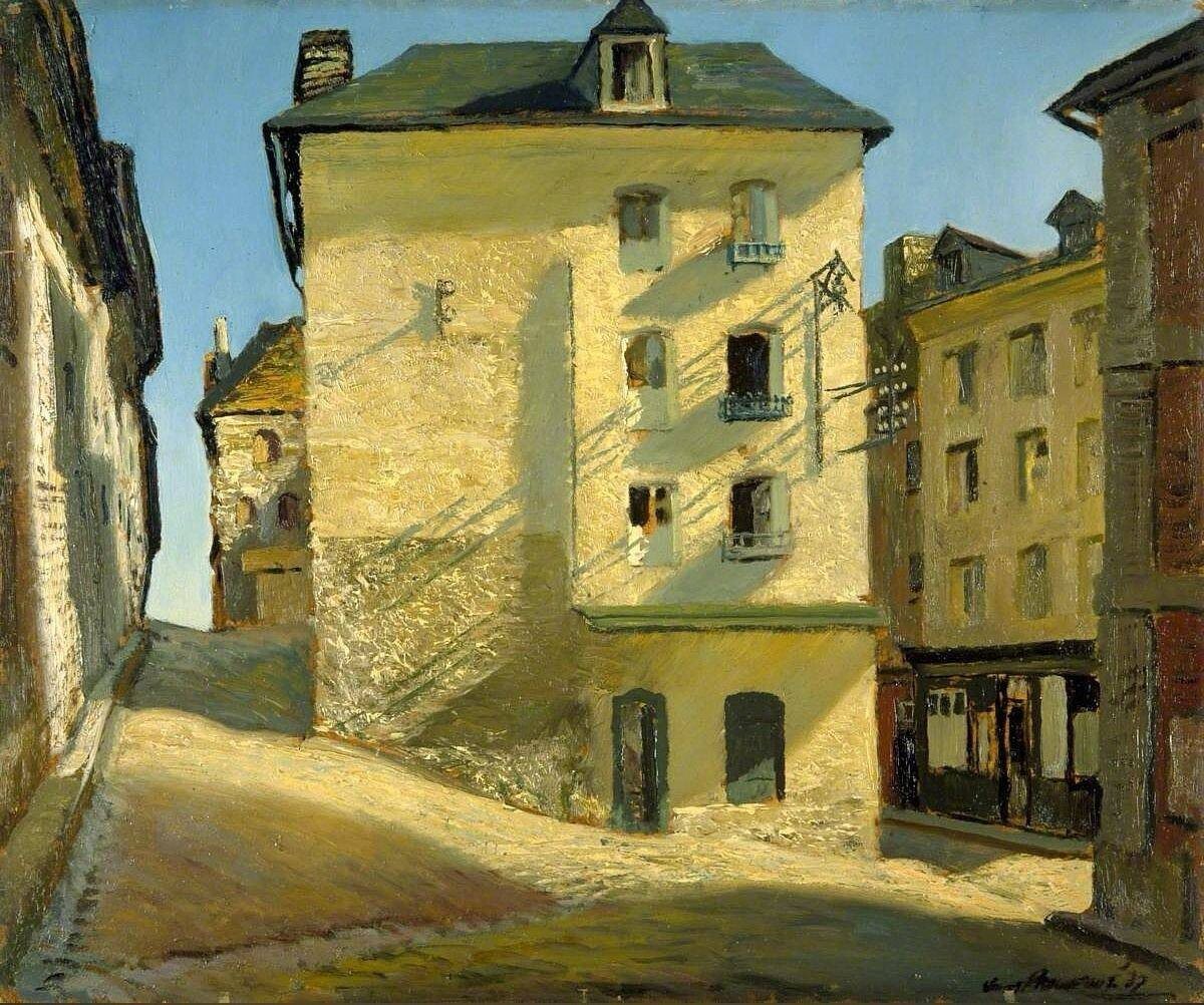 Джеймс Праудфут "Солнечный дом, Дьепп", 1937 Тихий уголок северной Франции в тёплом солнечном мареве — Праудфут ловит не событие, а состояние. Дом на холме будто светится изнутри, и кажется, что вот-вот распахнётся окно, и кто-то поставит туда чашку кофе. Картина — как мгновение отпуска, которое хочется удержать.