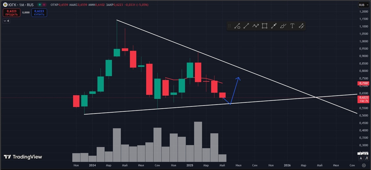 На графике для меня тут падающая тенденция, несмотря на то, что мы приближаемся к поддержке. Отбой от поддержки всего лишь обозначит движение в сужающемся диапазоне. Как уже вы знаете, мне нужна небольшая волатильность выше скользящей, чтобы можно было поставить небольшой стоп. Ну а в целом пока тут делать нечего. Уровень поддержки на сегодня 0,58р., а уровень сопротивления 0,84р. Выкупать просадки не в моей стратегии. Я лучше встану по более высокой цене, но в растущую тенденцию и поработаю со стопом, чем докупать на падении. Не является индивидуальной инвестиционной рекомендацией. #рубрикамесяц
