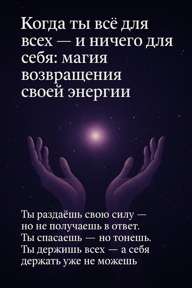 Ты сильная. Ты та, к кому приходят с болью, вопросами, проблемами. Ты та, кто поддержит, успокоит, найдёт решение. Ты — опора. Свет. Помощь. Спокойствие. И только ты знаешь, каково это — ложиться ночью и чувствовать, что внутри пусто. Ты раздаёшь свою силу — но не получаешь в ответ. Ты спасаешь — но тонешь. Ты держишь всех — а себя держать уже не можешь. Это не потому, что ты слабая. Это потому, что ты забыла вернуть себе себя. Симптомы, которые ты игнорируешь Эти состояния — не лень и не “просто стресс”. Это энергетический дефицит. Ты — сосуд, из которого все пьют. Но ты забыла наполняться. Почему это происходит С детства тебе говорили: — будь удобной — не будь эгоисткой — помогай — терпи — будь хорошей девочкой Ты научилась быть для других. Но тебя никто не научил быть для себя. И теперь, когда тебе нужна поддержка, ты слышишь от мира: — «Ты же сильная» — «Ты справишься» — «Ты же ведьма, ты же в магии, ты же осознанная» И внутри хочется закричать: А кто, блин, будет сильным