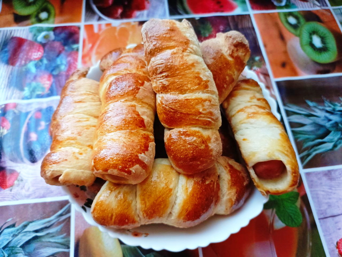 3. Формирование: Разделите тесто, сделайте жгутики диаметром 1,5 см и оберните вокруг сосисок. Выложите на смазанный противень.