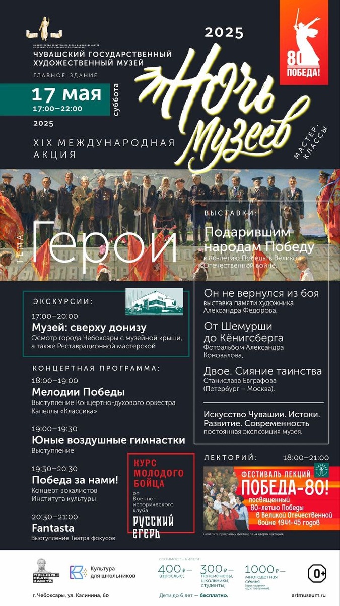 Ждём ВАС на программу "Ночи музеев" в Художественном музее, СЕГОДНЯ 17 мая, по адресу: Чебоксары, ул. Калинина, д. 60 с 17 до 22 часов. Концертная программа начнётся ⏱️️в 18:00. Параллельно, начнётся Фестиваль лекций "ПОБЕДА-80!" ⏱️в 18:00. Мастер-классы и Игротека, начнут принимать всех желающих ⏱️в 17:30. Музейная крыша и реставрационная мастерская ⏱️с 17 до 20:00. Буфет ⏱️с 16:00.