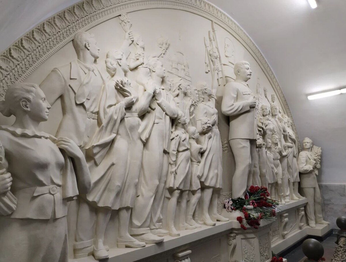 На Таганской-кольцевой к 90-летию открытия московского метро восстановили скульптурную композицию "Благодарность народа вождю-полководцу" (в народе "Сталин и дети"), посвящённую победе в Великой Отечественной войне (как и всё оформление станции Таганской-кольцевой, кстати): Эта композиция находилась в торце центрального зала Таганской-кольцевой.