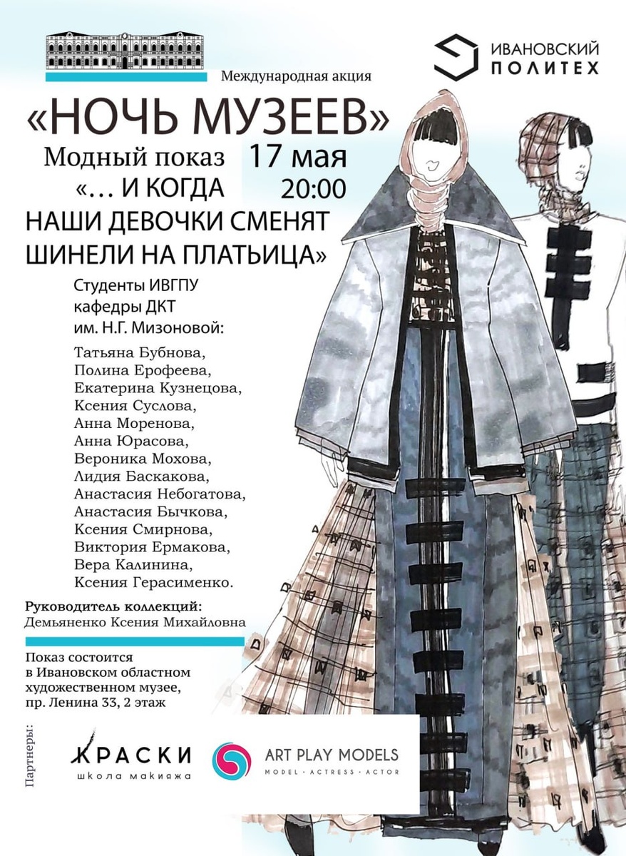 Кафедра дизайна костюма и текстиля им. Н.Г. Мизоновой приглашает на дебютный показ студенческих коллекций одежды, который пройдет сегодня в «НОЧЬ МУЗЕЕВ» в Ивановском областном художественном музее 🌃 14 коллекций студентов 3-го курса раскрывают множество тем: семейные ценности, народные и национальные традиции, история страны и своей малой родины, киноискусство, художественные промыслы. Начинающие дизайнеры интерпретируют современные тренды и выражают свои уникальные идеи. На первый взгляд такие разные, эти коллекции объединяет одно: яркие, смелые, созданные талантом молодых и дерзких, – они как дуновение свежего ветра и надежда на светлое будущее. Руководитель коллекций – доцент кафедры Ксения Демьяненко 📅 17 мая в 20:00, пр. Ленина, 33, 2 этаж.