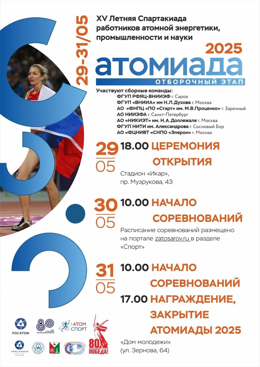 В юбилейной Летней Спартакиаде работников атомной энергетики, промышленности и науки примут участие команды из Сарова, Москвы, Заречного, Санкт-Петербурга и Соснового Бора.