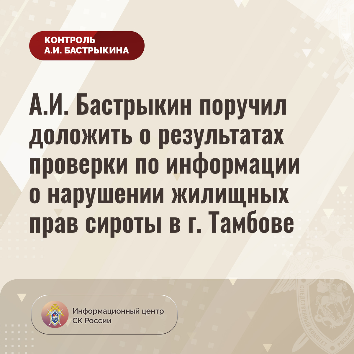 А.И. Бастрыкин поручил доложить о результатах проверки по информации о нарушении жилищных прав сироты в г. Тамбове