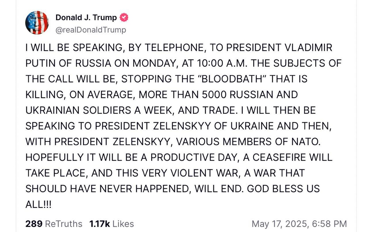 ❗️Дональд Трамп в своей соцсети написал, что в понедельник проведет телефонный разговор с Владимиром Путиным