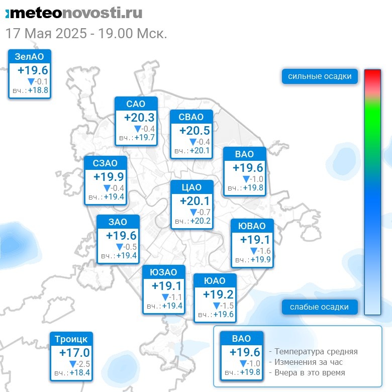 В 19:00 в Москве было от +18°C до +20.9°C, средняя температура +19.7°C #погода #Москва #весна #температура #17мая #суббота