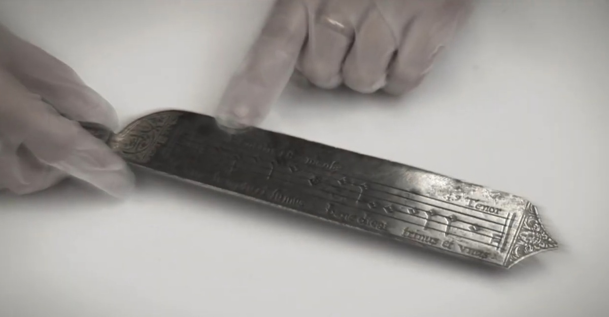 В Музее Виктории и Альберта (Лондон) хранится один из таких ножей. Он подписан: Benedictio Mensae. Qui vult manducare cibum... — благословение трапезы, исполнявшееся перед едой. Другая сторона содержит текст Gratiarum Actio post mensam, благодарение после. Сам клинок служило одновременно и музыкальным манускриптом, и практическим инструментом. Но, скорее всего, резали им редко. Эти предметы были символами.
