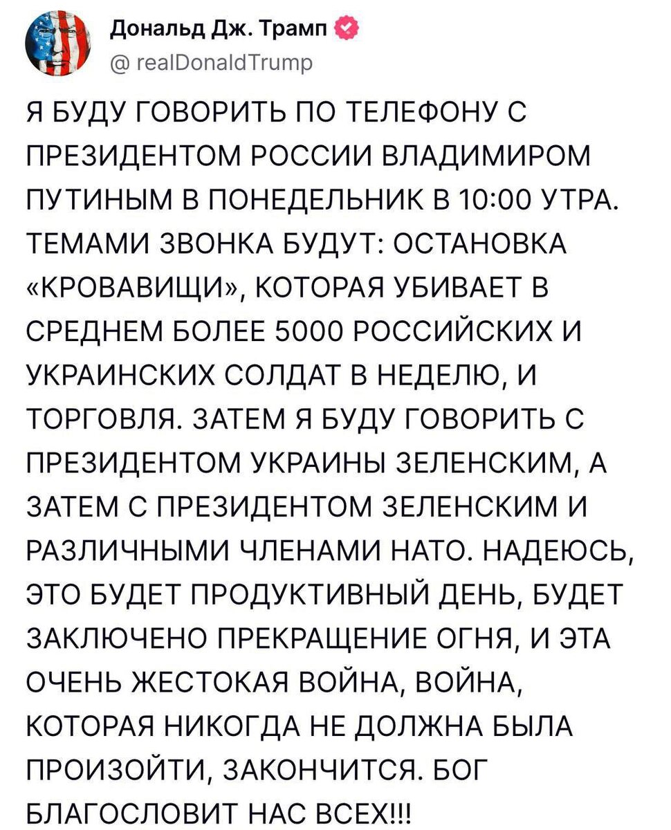 Трамп кинет дозвон Путину В понедельник состоится созвон двух мировых лидеров. Инсайдеры сообщают, что США хотят отдать 4 области той самой Украины, а взамен контроль над Запарожской АЭС и редкими металлами Донбаса. #лайфстайл@kazan_smi Договорятся? 👍/👎 👍 Подписаться на канал БЕСПЛАТНЫЙ РОЗЫГРЫШ