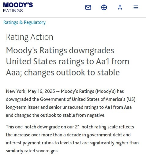 Рейтинговое агентство Moody's понизило рейтинг США с уровня ААА до уровня АА1.