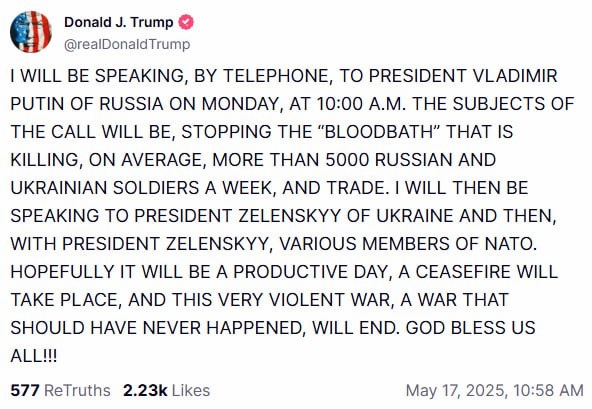 Я буду говорить по телефону с президентом Владимиром Путиным из России в понедельник в 10:00 утра. Темами разговора будут прекращение «кровопролития», которое уносит в среднем более 5000 жизней российских и украинских солдат в неделю, и торговля. Затем я поговорю с президентом Зеленским из Украины, а затем — с президентом Зеленским и различными членами НАТО. Надеюсь, это будет продуктивный день, будет достигнуто соглашение о прекращении огня, и эта крайне жестокая война, война, которая никогда не должна была начаться, закончится. Да благословит нас всех Бог!!!