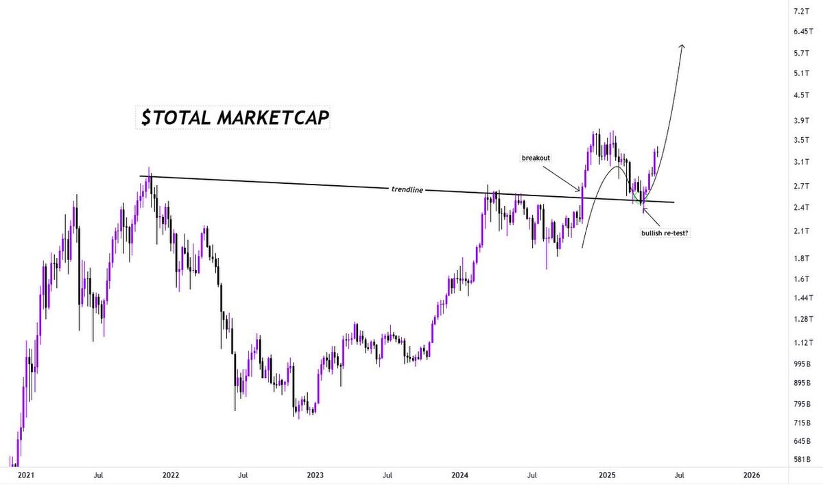 TOTAL MARKETCAP: бычий перетест и взлёт? Общая капитализация крипторынка сделала textbook-движение: 1. Пробой даунтрендовой линии, которая сдерживала рост больше 2 лет. 2. Чистый возврат к ней — перетест уровня (такое не часто увидишь на недельке). 3. И сейчас — отскок вверх с объёмом. Технически — это один из самых сильных сигналов продолжения тренда. Вариант “новый ATH” — не вопрос “если”, а “когда”. К чему это приведёт? — Деньги снова заходят в рынок. — Рост может быть экспоненциальным, особенно если подключится ритейл. — Это может быть началом фазы эйфории, где уже не фундамент, а инерция и FOMO рулят. До каких пор можем дорасти? Мои примерные расчеты и прогнозы здесь. Вывод: Рынок показал силу, и пока это движение не сломано — стоит думать в сторону роста, а не шорта. Продолжим тему в отдельном посте: какие сектора могут лидировать этот рост? Напишите, если интересно — разберу подробнее. #крипторынок #биткоин #инвестирование #рынок