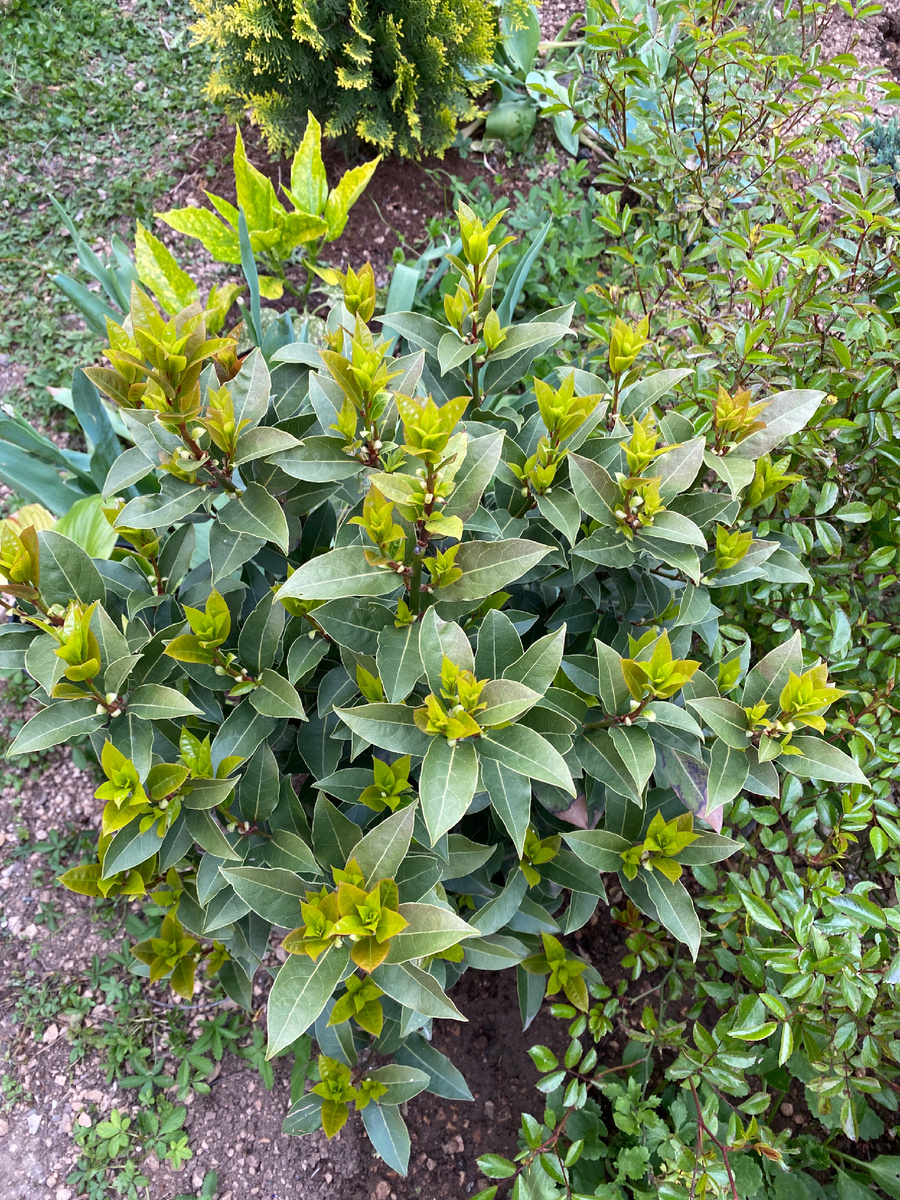Отлично смотрится и поднимает настроение отрастающий после поздне-осенней стрижки куст лавра. Вторую зиму прошла аукуба и выдала первые молодые приросты.