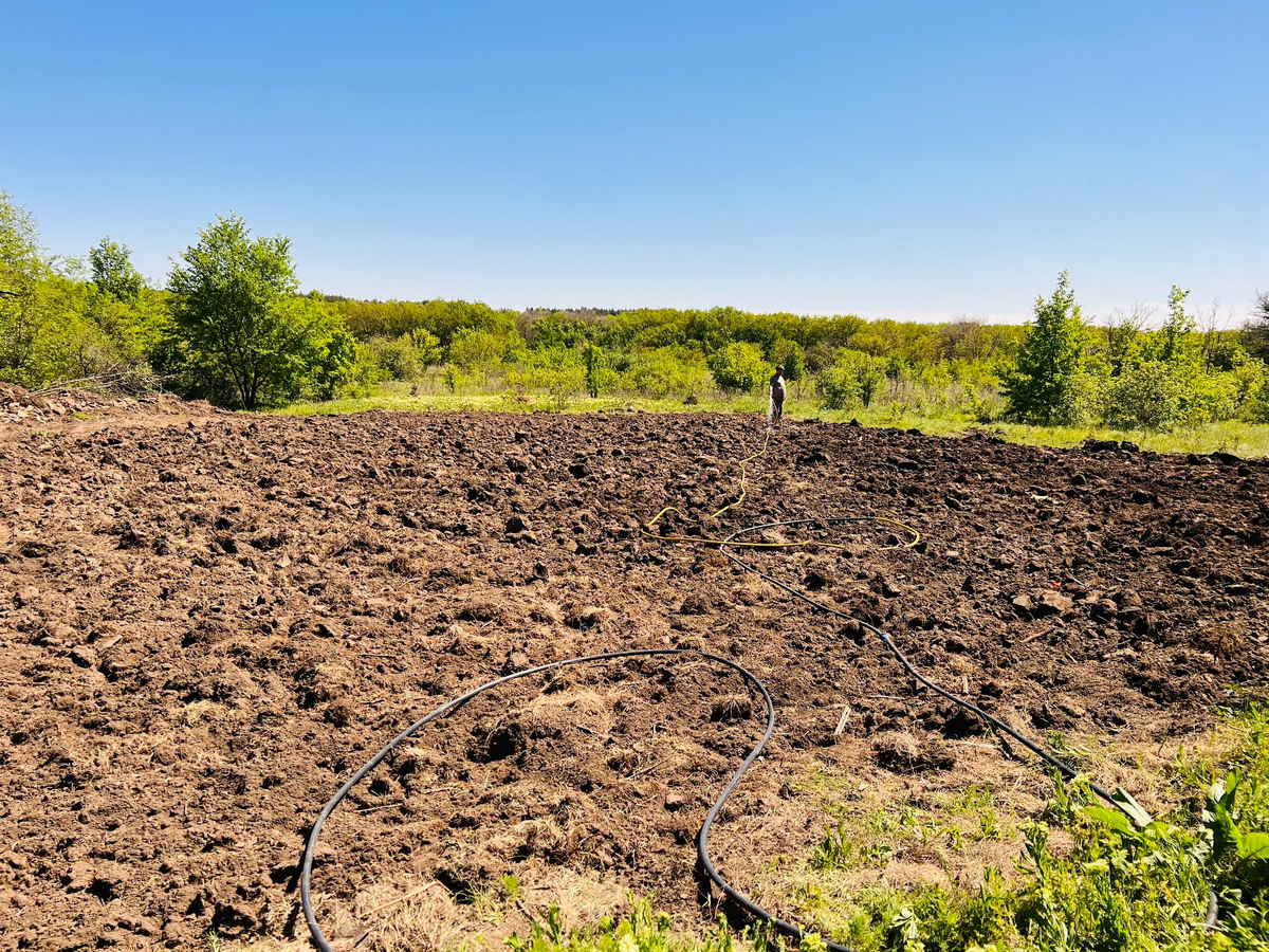 Да, расчистили экскаватором, вспахали трактором, сейчас пройдёмся культиватором, потому что 5 лет я смотрела на этот пырей и заросли груши и вишни, прикрывала картонками и соломкой, что-то подрубывали, но все 5 лет это было е-рун-дой. И не было у нас нормального огорода. Больше пахать, надеюсь, не будем. Справимся мульчей. А пока проливаем чтобы прокультивировать (у нас уже засушливо), и замачиваем семена. Много семян!