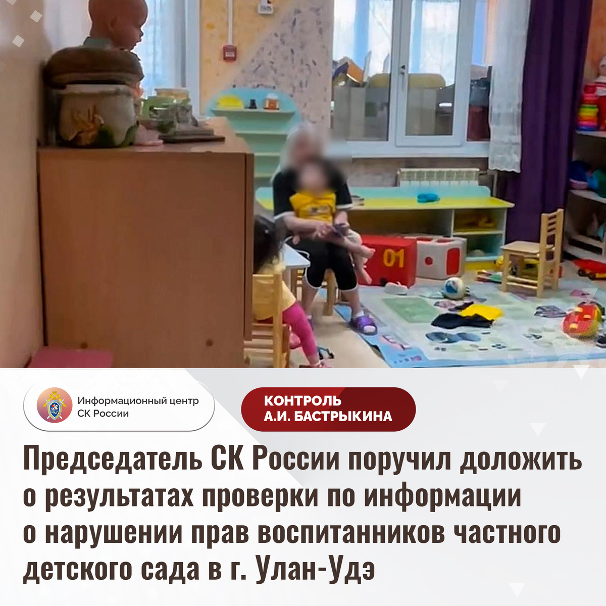 Председатель СК России поручил доложить о результатах проверки по информации о нарушении прав воспитанников частного детского сада в г. Улан-Удэ В эфире федерального телеканала сообщалось, что 15 мая текущего года в одном из частных детских садов в городе Улан-Удэ Республики Бурятии сотрудники учреждения находились на рабочем месте в состоянии алкогольного опьянения и не осуществляли контроль за воспитанниками. В результате один ребенок оказался на улице без присмотра. В СУ СК России по Республике Бурятии по данному факту начата процессуальная проверка. Председатель Следственного комитета Российской Федерации Александр Иванович Бастрыкин поручил руководителю СУ СК России по Республике Бурятии Евгению Вячеславовичу Лагацкому доложить о промежуточных результатах процессуальной проверки и принятом по итогам решении. Исполнение поручения, а также ход процессуальной проверки поставлены на контроль в центральном аппарате ведомства. #СледственныйКомитет #СКРоссии #СКР #ИЦСКР #Информационныйце