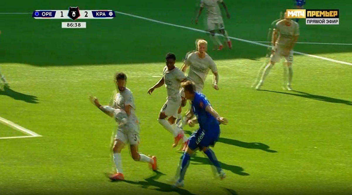 Оренбург-Краснодар 87 мин. Правильное решение принимает Казарцев и продолжает игру. Рука игрока команды Краснодар прижата к телу. Правильное решение: Нет нарушения правил, продолжить игру, не ВАР вмешательство.