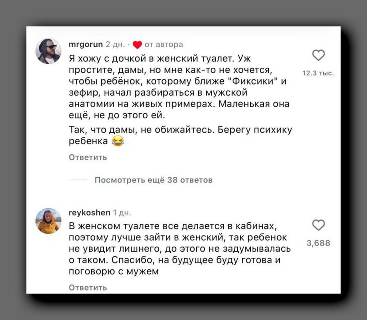 В Сети развернулась очередная жаркая дискуссия. Поводом стал ролик, в котором папа ведёт маленькую дочку в туалет торгового центра - и заходит с ней в мужской. Рилс вызвал настоящий шквал комментариев. Большинство зрителей сошлись на том, что в подобных ситуациях папе стоит выбирать «дамскую комнату». Аргумент: в женских туалетах есть кабинки, а значит - меньше шансов, что ребёнок столкнётся с «ненужными» визуальными открытиями. К тому же женщины обычно спокойнее реагируют на детей, даже если сопровождает их мужчина. Главное - на входе предупредить: «Мужчина с ребёнком!» Так сказать, объявление тревоги - но вполне доброжелательной. Другие, в основном мужчины, придерживаются противоположного мнения. Они считают, что посещение мужского туалета с дочкой - менее проблематично. Всё быстро, все заняты своими делами, а писсуары легко обойти. А вот женский туалет, по их мнению, - территория повышенного риска неловкости: кто-то может поправлять одежду, косметику или просто не ожидать увидеть