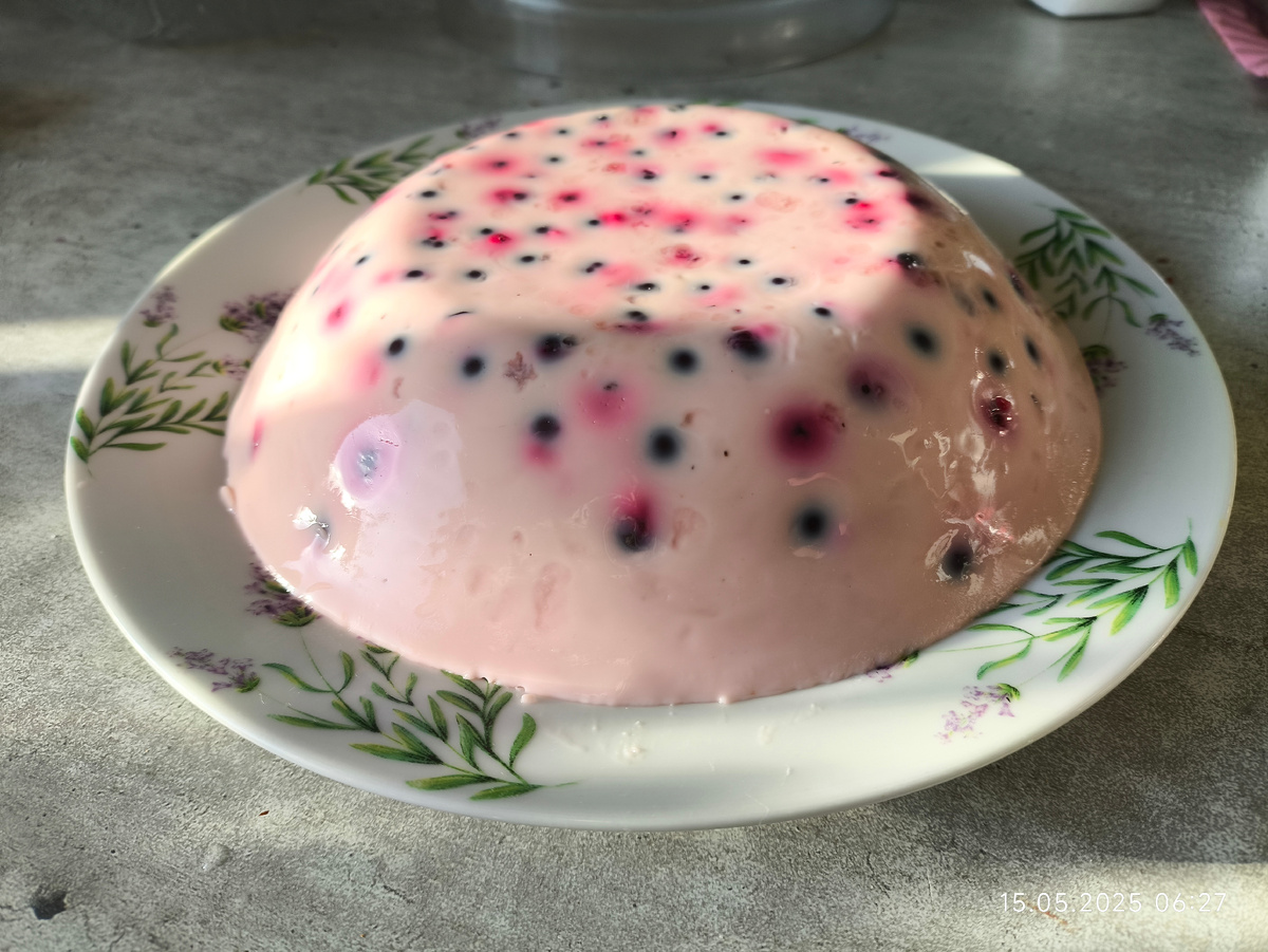 Всё очень просто: берем 200 граммов смородины, добавляем 100 милилитров воды и 30 граммов быстрорастворимого желатина. Все это отправляем на минуту или полторы в микроволновку. Доливаем 400 граммов ряженки, сахарозаменитель 10 граммов, хорошо перемешивание, вливаем в форму и ставим на час в холодильник.