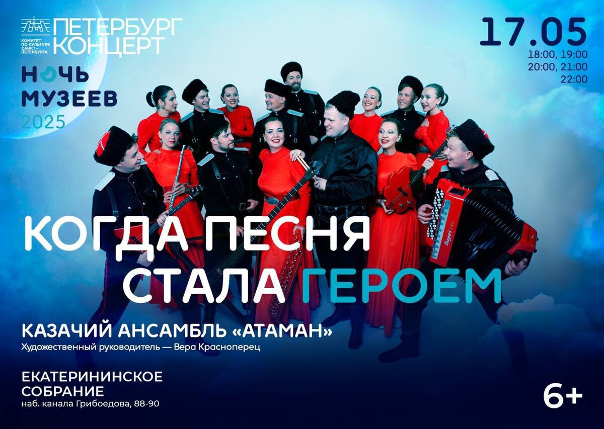 Гостей концертной программы ждет встреча с Казачьим ансамблем «Атаман» имени А. М. Красноперца. В их творческом арсенале — вокальное мастерство, народные танцы, виртуозная игра на народных инструментах и даже каскадерские трюки! В исполнении солистов ансамбля прозвучат былинные напевы, стихи, отрывки из дневников и фронтовых писем, и конечно, песни-легенды, песни-герои, которые знает и любит вся страна: от «Священной войны» до лирических казачьих баллад.