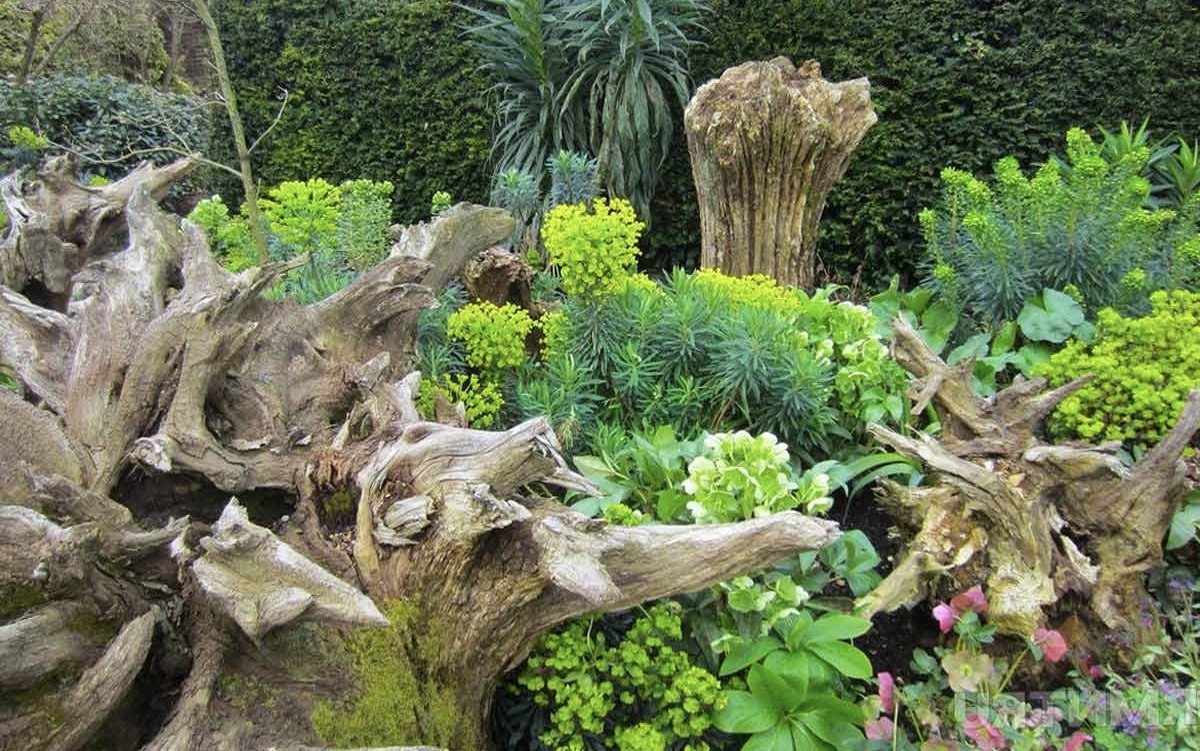 Из пеней и коряг можно создать интересную композицию, которую затем украсят тенелюбивые растения.
