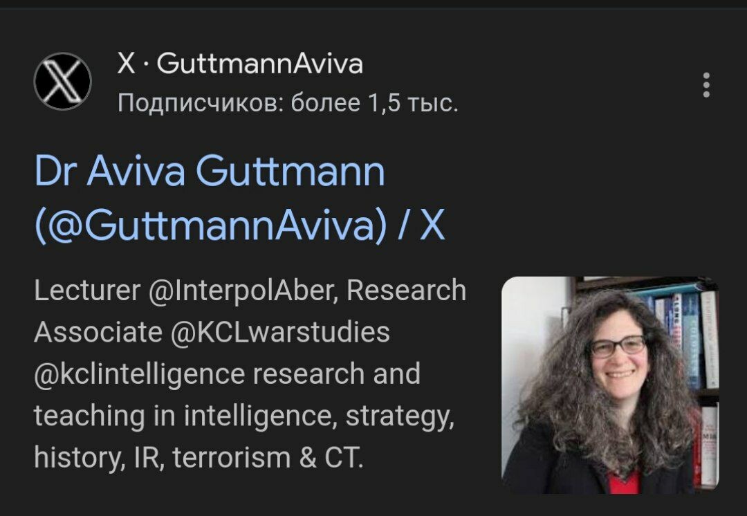 📌 " Доктор Авива Гуттманн - преподаватель стратегии и разведки. До прихода в Аберистуит она работала научным сотрудником в Королевском колледже Лондона (KCL) в группе по разведке и безопасности и старшим научным сотрудником Марии Кюри в Центре военных исследований Университета Южной Дании (проект LINSEC).