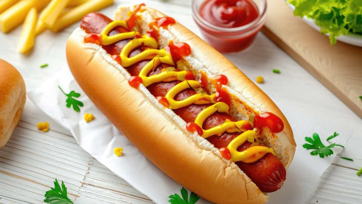 Идеальный классический хот-дог Порций: 1 Время приготовления: 15–20 минут Ингредиенты (с точными граммовками): - Булочка для хот-дога — 50–60 г (лучше мягкая, слегка сладковатая, с кунжутом или без). - Сосиска (говяжья/свиная, высшего сорта) — 60–70 г. - Кетчуп — 10–15 г. - Горчица (классическая или дижонская) — 5–10 г. - Майонез (опционально) — 5–10 г. - Маринованные корнишоны — 20 г (нарезать кружочками). - Лук репчатый — 10 г (мелко нарезать, можно карамелизовать). - Квашеная капуста (опционально) — 30 г. - Соус чили (по желанию) — 5 г. - Растительное масло — 1 ч. л. (для обжарки). Пошаговый рецепт: 1. Приготовьте булочку: - Разрежьте булочку вдоль, не до конца, чтобы образовался «карман». - Подсушите в тостере, на сковороде без масла или в духовке (2–3 минуты при 180°C). 2. Обжарьте сосиску: - Нагрейте сковороду с растительным маслом. - Обжаривайте сосиску 4–5 минут на среднем огне до золотистой корочки. 3. Сборка хот-дога: -