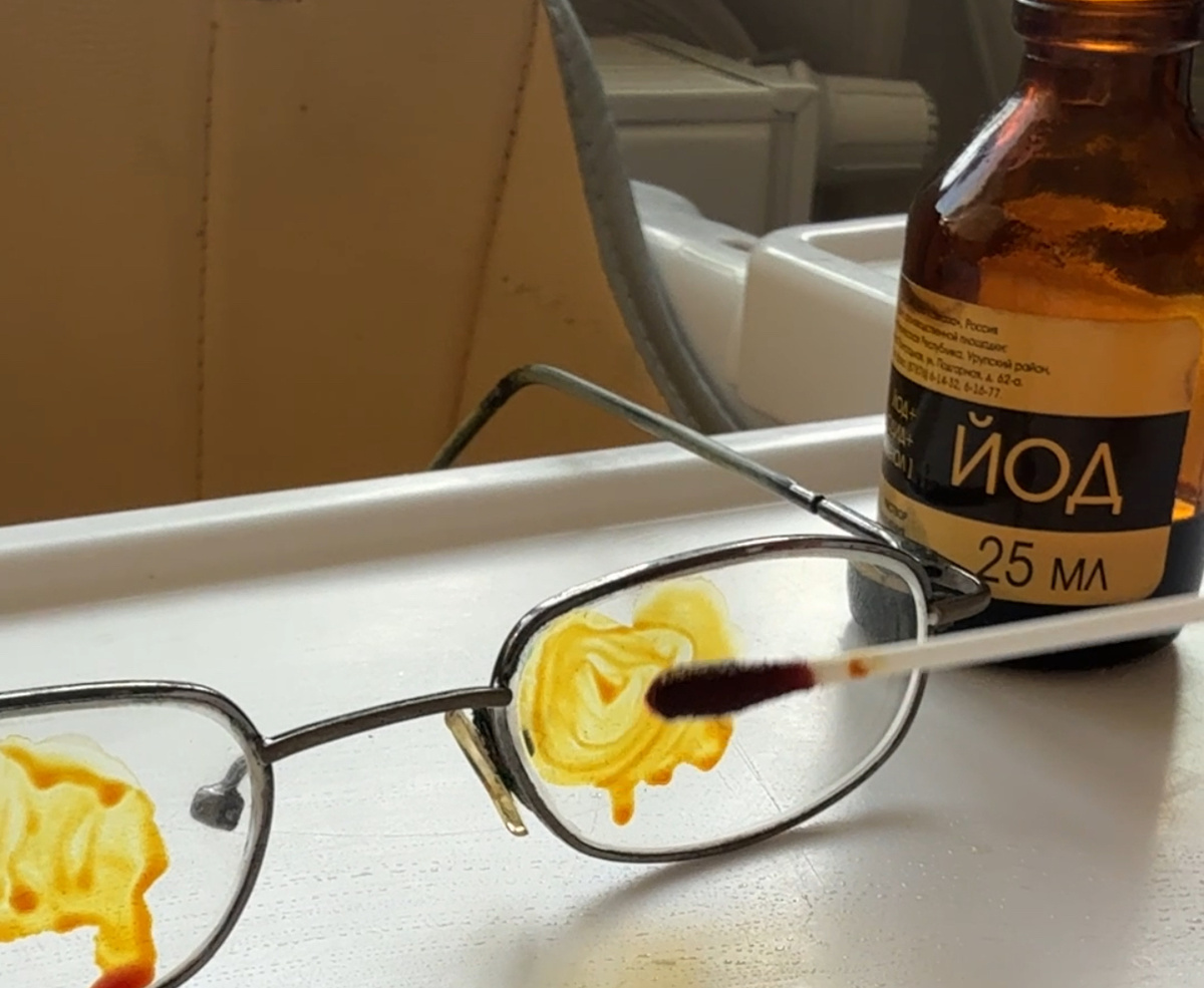 Нанесла йод на очки. Я не ожидала, что это будет настолько мощно. Старые затертые очки будут как новые