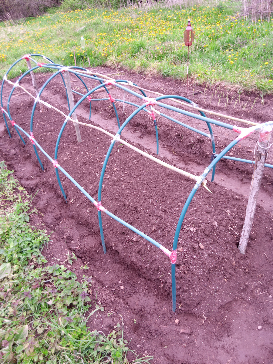Ну и вот. Вбил я ещё один колышек посередине каркаса и сделал две поперечины. Ветра у нас тоже неплохие бывают, а конструкция всё-таки высокая, метр над землёй.