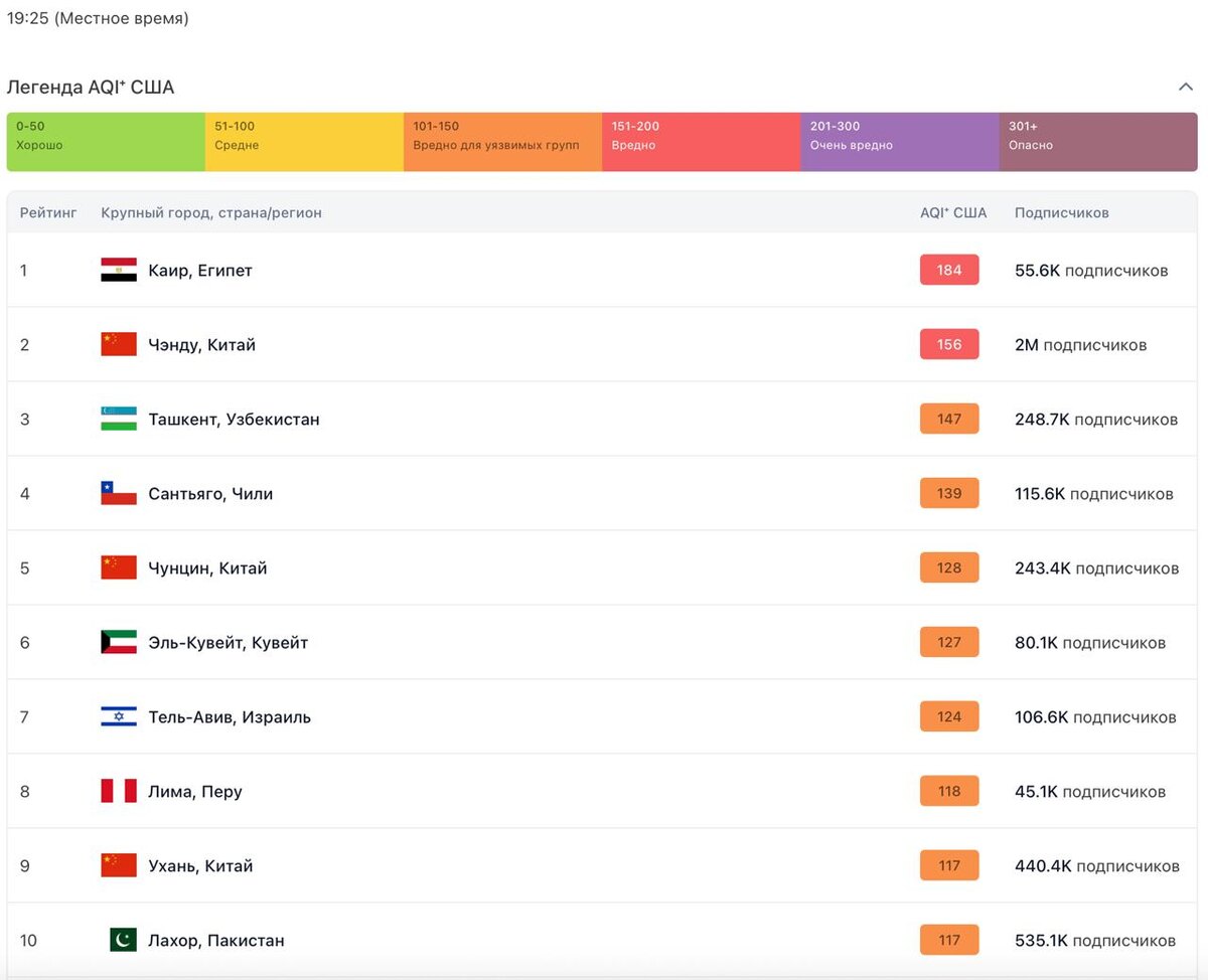 Toshkent havoning ifloslanish darajasi bo‘yicha soat 19:25 holatiga dunyoning yirik shaharlari orasida 3-o‘ringa chiqdi @daryolive