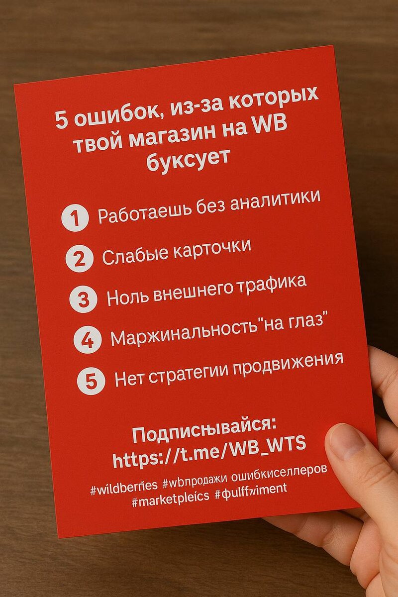 5 ошибок, из-за которых твой магазин на WB буксует Кажется, всё сделал правильно: товар выложил, цены норм, но продаж нет? Скорее всего, ты попал в одну из этих ловушек: 1. Работаешь без аналитики — действуешь наугад, не понимая, что работает. 2. Слабые карточки — плохие фото, тексты без УТП и ключей. 3. Ноль внешнего трафика — WB не будет тебя продвигать просто так. 4. Маржинальность “на глаз” — в итоге работаешь в минус. 5. Нет стратегии продвижения — хаос вместо понятного плана. Хочешь пошагово разобраться, что делать, чтобы выйти в плюс? Подписывайся: https://t.me/WB_WTS Разбираем кейсы, выкладываем фишки, помогаем селлерам расти. #wildberries #wbпродажи #ошибкиселлеров #маркетплейс #фулфилмент #WTS