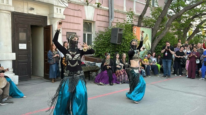Так, у Краеведческого музея девушки в красивых нарядах исполнили несколько номеров восточного танца под аутентичную живую музыку.