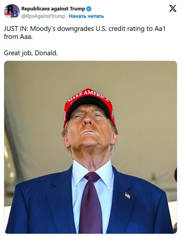 В пятницу 16 мая агентство Moody's изменило рейтинг США с ААА (прогноз - негативный) до Аа1 (прогноз — стабильный). Это понижение на 1 ступень в 21-ступенчатой рейтинговой шкале агентства. Больше США не имеют «трипл эй» ни в одной из рейтинговых компаний «большой тройки»: S&P снизило рейтинг в 2011 году, Fitch - в 2023. Основание: бюджетные дефициты, которые увеличивают госдолг и расходы на его обслуживание. И только по этой причине Moody's ждет рост бюджетного дефицита США до 9% в 2035 (6,4% в 2024), и рост долга до 134% ВВП (98% в 2024). Вроде бы разница очень небольшая. По определению самого Moody's, США перешли из категории стран с нижайшим кредитным риском в страны с очень низким кредитным риском. Но удар по Трампу вышел знатный. Понижение рейтинга именно сейчас, когда все его планы наконец проявлены, а будущие эффекты их пока еще неясны. Фактически все усилия Трампа по снижению дефицита бюджета (ради чего и была затеяна мировая торговая война) признаны «пшиком». Момент выбран аге