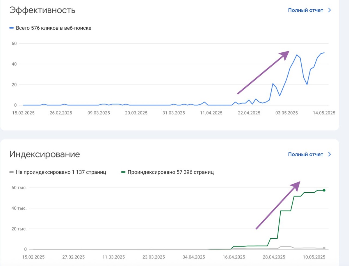 Просто делюсь опытом - проект poisk.im, стадия бета. Гугл как-то индексирует и можно наблюдать зависимость между количеством страниц в индексе с кликами из поиска. Ясно, что делать выводы сложно, но в конечном итоге - чем больше страниц в индексе, тем больше кликов. Как-то так, (с) Кэп Очевидность. И да, у нас React без SSR, сейчас будем решать с этим (за май, надеюсь, решим). Русский ИТ бизнес