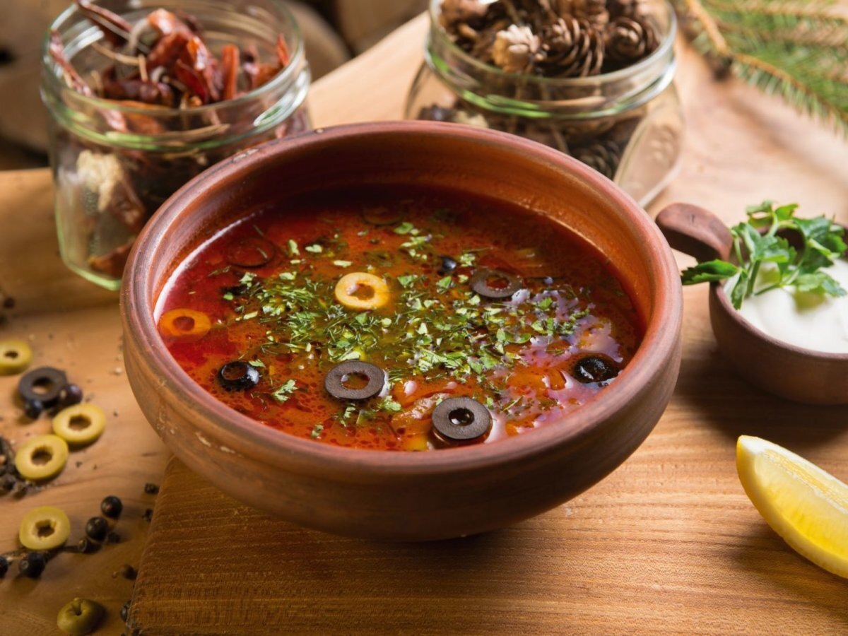 Солянка — это сытный и пряный суп, который любят за его густоту, насыщенный вкус и лёгкую кислинку. Готовится он на мясном бульоне с добавлением копчёностей, маринованных огурцов, маслин и лимона. Идеально подойдёт для холодной погоды или просто в качестве плотного обеда.