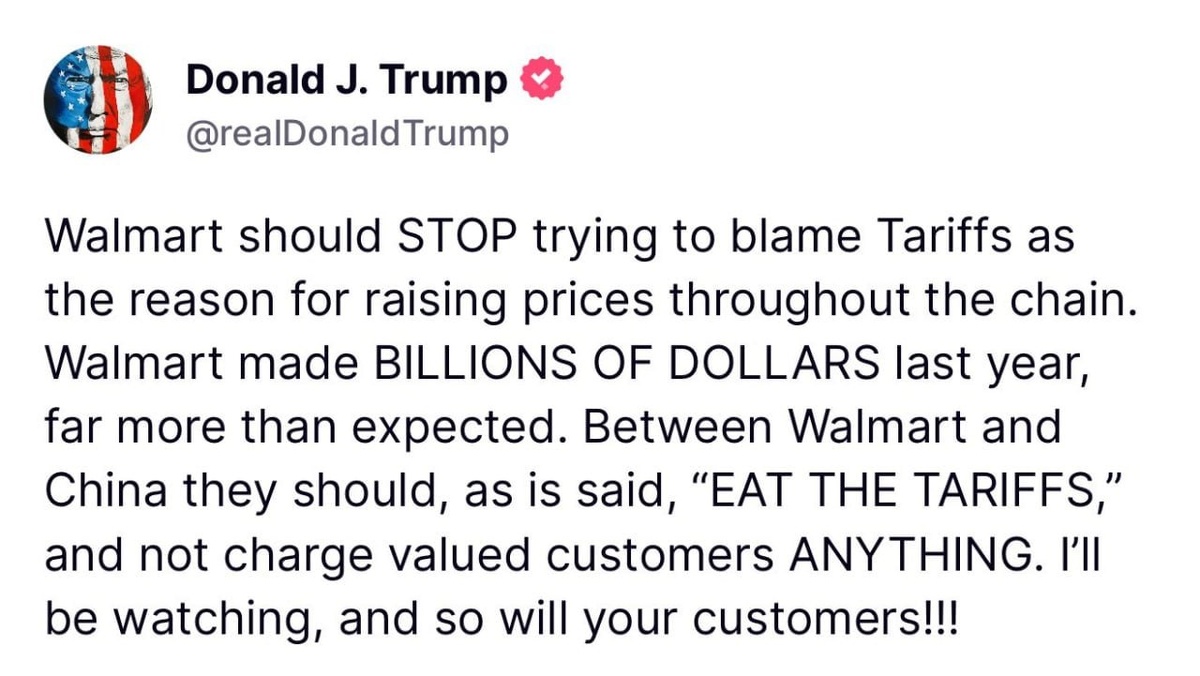Trump tells Walmart to 'EAT THE TARIFFS' instead of raising prices Says the company made billions and should stop blaming China duties Admin continues to draw battle lines between corporate profits and consumer loyalty