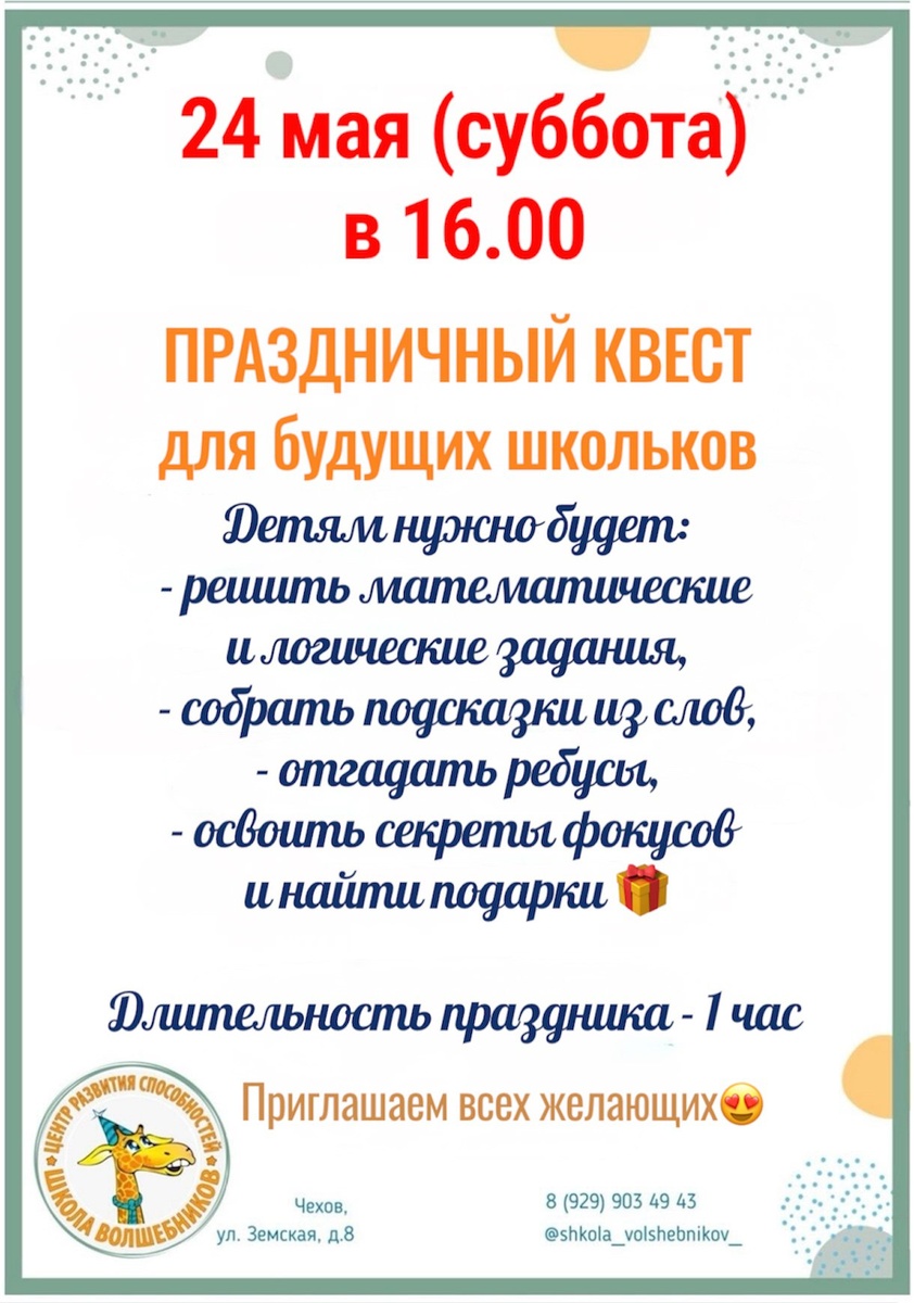✨ Кто тут у нас будущий первоклашка?🎒 Пора примерить ранец знаний и отправиться… не в школу, а на *весёлый праздничный квест*!🎊 Приглашаем ваших непосед (5–6 лет) на яркое приключение, где каждый ребёнок почувствует себя настоящим школьником — *но без домашних заданий!* Что будет: - логические и математические задания - весёлые конкурсы и игры (загадки, ребусы) - много фокусов и конечно, *подарки!*🎁 *Мест мало – желающих много. Забронируйте участие заранее!* 🏢 Центр Развития "ШКОЛА ВОЛШЕБНИКОВ" 📍 г.Чехов, микрорайон Губернский, ул.Земская, д.8 🔗 Записаться: https://wa.me/+79299034943 #детямЧехов ✅ Мероприятия Чехов https://dzen.ru/id/66cc4b48e9ef144699238a51 http://vk.com/chekhov_events http://dzen.ru/chekhov_events