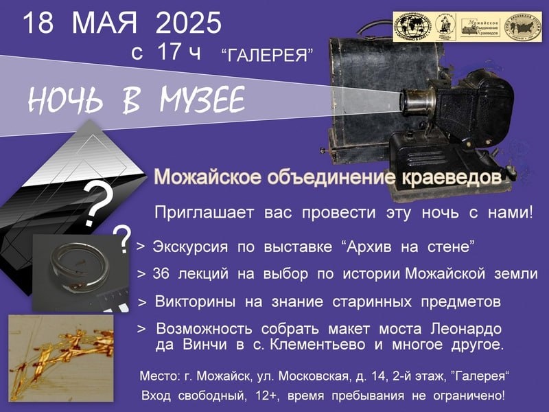 Можайские краеведы всю ночь буду удивлять можайцев тайнами города 18 мая кроме обычной экскурсии по выставке и предложенных лекций они приготовили для вас настоящую включённость в действо! Многочисленные друзья, активно пополняющие фонды будущего краеведческого музея, приносят и предметы, малопонятные порой, а иногда и непонятные вовсе. Да, прошло каких-то 100-150 лет, а знания о назначении многих предметов той поры уже утеряны... Краеведы вместе с гостями праздника (и действительно, есть предметы, назначение которых неизвестно нам самим) попробуют определить - ЧТО это было? Начнут с простых бытовых предметов, а закончат настоящими загадками, над которыми сами ломают голову :) Обещают, что лучших "отгадывальщиков" ждут призы! Краеведы по традиции покажут молодёжи гаджет их бабушек и прабабушек - диапроектор с настоящими диафильмами. Начало в 17.00. г. Можайск, ул. Московская, д.14, 2-й этаж