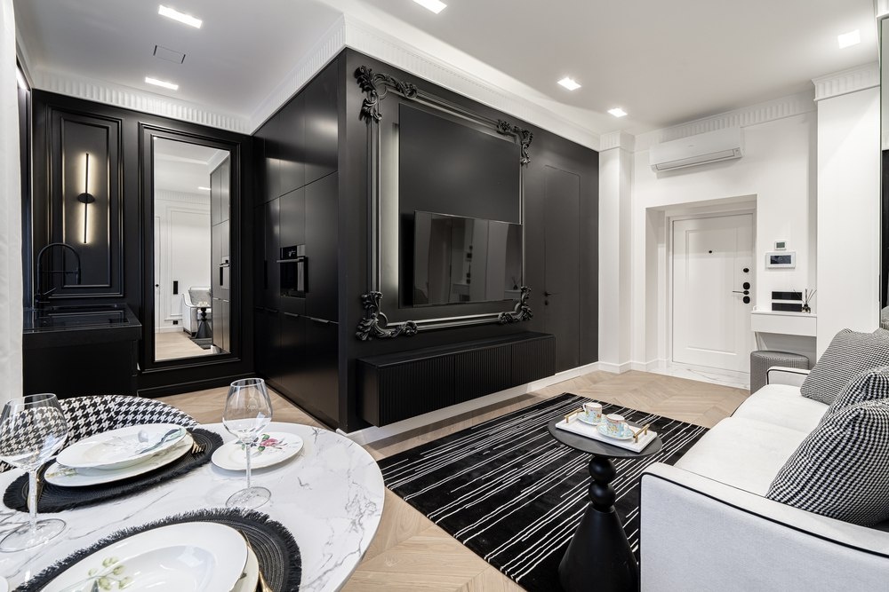 Анна Голдина и Константин Голдберг спроектировали эффектный ахроматичный интерьер в старом фонде в Хамовниках. Они снесли все стены и узаконили новую планировку. Для оформления была использована черно-белая цветовая палитра, которая создает элегантный и сдержанный интерьер. Стиль неоклассики привносит изысканность и утонченность, гармонично объединяя современные элементы с классической эстетикой.