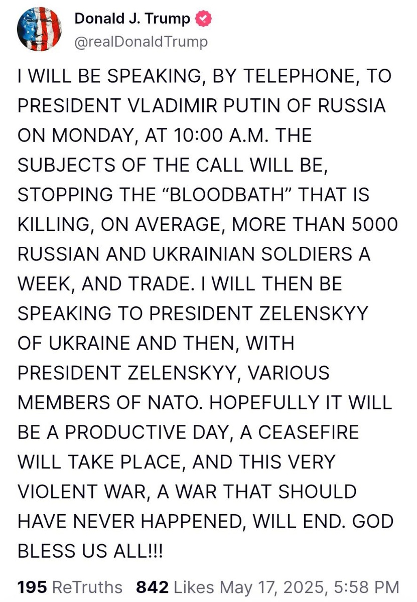 ❗️Trump says he'll be calling Putin MONDAY morning